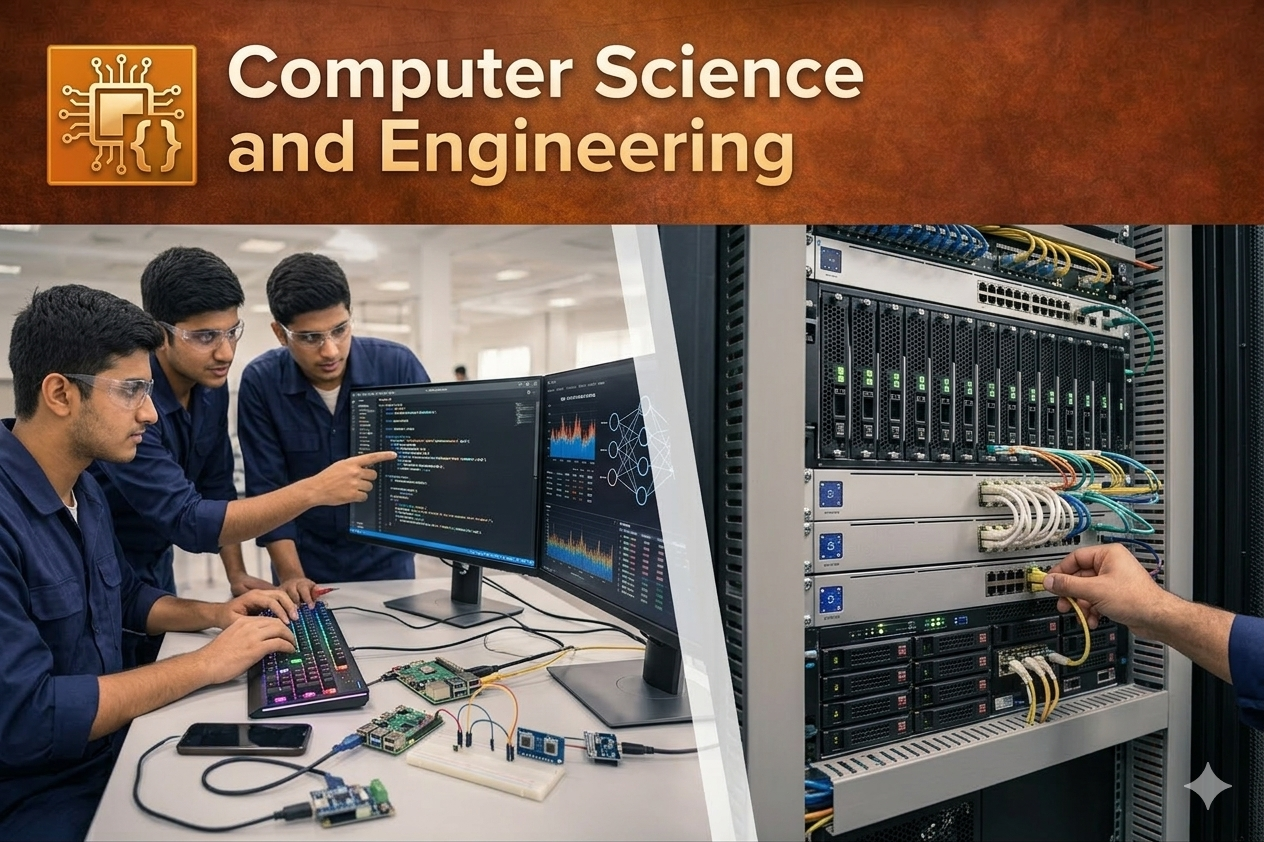 Computer Science & Engineering focuses on computer programming, software development, networking, and cybersecurity. Students gain knowledge of programming languages, data structures, databases, and modern computing technologies.